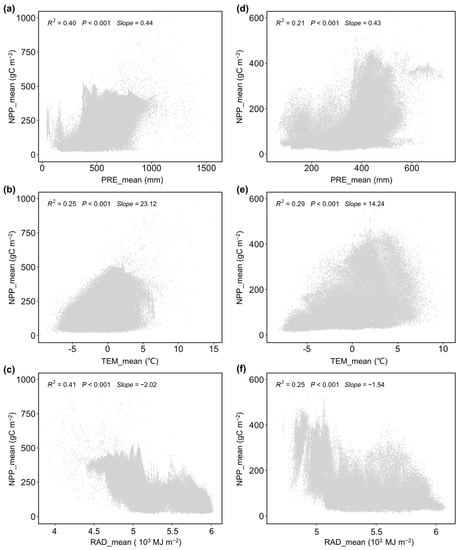 Relationships between NPP and climate variables (PRE, TEM, RAD) in the alpine meadow (a–c) and alpine steppe (d–f).