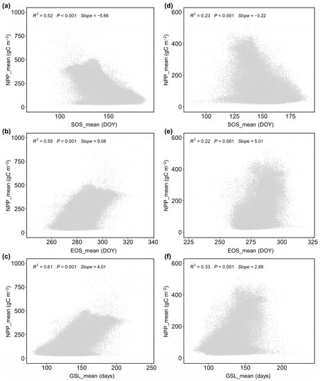 Vegetation phenology, including the start of the growing season (SOS), the end of the growing season (EOS), and the length of the growing season (GSL), plays a crucial role in determining the timing and duration of canopy photosynthetic activity, and drives ecosystem carbon sequestration [,]. Over the past decades, both satellite and ground-based evidence has shown significant shifts in plant phenology in response to the global surface mean temperature increase, especially in most regions of the Northern Hemisphere []. These changes in vegetation phenology have implications for ecosystem structure and functions, as they directly impact surface energy exchange, water cycling, and terrestrial carbon cycling []. An increasing number of studies have been carried out to examine the impact of phenological change on ecosystem productivity [,,]. Such studies are valuable for protecting and managing ecosystems under the background of global change and promoting sustainable human development [,]. However, there are still two unresolved issues. Firstly, while it is widely acknowledged that changes in vegetation phenology can influence plant production, the relationship between phenological changes, such as prolonged GSL and advanced SOS, and vegetation productivity remains a subject of ongoing debate [,,]. Secondly, although it is recognized that climate change has and will continue to alter the impacts of plant phenology on ecosystem productivity [,], there is still debate about the relative contributions of climate and vegetation phenology to changes in vegetation productivity [,,]. Hence, it is necessary to comprehensively study the effects of phenological variability on NPP and its interaction with climate change.