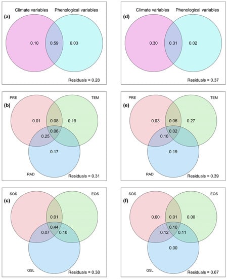 The varpart analysis showed that NPP_mean variations in the alpine meadow were primarily explained by the combined effects of climate and phenological variables (Figure 6a). In contrast, climate variables had a stronger influence on NPP_mean variations in alpine steppes compared to phenological variables (Figure 6d). TEM_mean had the largest exclusive effects on NPP_mean in both alpine meadows and alpine steppes, and RAD_mean had a comparable impact to PRE_mean and TEM_mean on NPP_mean in these ecosystems (Figure 6b,e). Moreover, GSL_mean accounted for a greater proportion of NPP_mean variations than SOS_mean and EOS_mean in both alpine meadows and alpine steppes (Figure 6c,f).