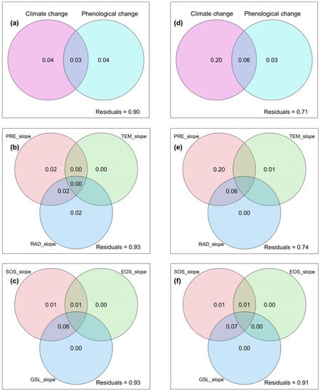 The variations in NPP_slope in alpine meadows were equally contributed to by both climate change and phenological change, while NPP in alpine steppes was predominantly influenced by climate change (Figure 7a,d). Moreover, in both alpine meadow and alpine steppe ecosystems, the variations in NPP_slope were primarily affected by PRE_slope and RAD_slope, rather than TEM_slope (Figure 7b,e). Specifically, PRE_slope had the largest exclusive effects on NPP_slope in the alpine steppe (Figure 7e). Regarding phenological changes, the impact of SOS_slope on the variations in NPP_slope was more pronounced compared to EOS_slope and GSL_slope in both alpine meadow and alpine steppe ecosystems (Figure 7c,f).