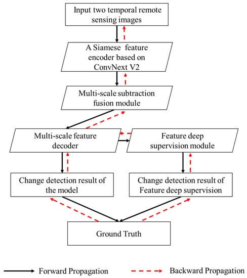 As the flowchart of MFSFNet shown in Figure 1, firstly, the inputs of MFSFNet are two temporal remote sensing images. Secondly, the images are fed into a weight-shared Siamese CNN to extract multi-scale features based on ConvNext V2. Thirdly, multi-scale features are fused by multi-scale subtraction fusion module. Fourthly, the fused features are decoded by a multi-scale feature decoder. The multiscale feature decoder has two branches, one that outputs the change detection results of the model, and a feature deep supervision branch that generates an additional change detection result through feature deep supervision. Lastly, both results are used with ground truth to compute the loss and perform loss back propagation. The module of feature deep supervision subjects the model to additional supervision. The black solid arrows in the figure show the sinusoidal propagation path of the data and the red dashed arrows show the backward propagation path of the gradient.