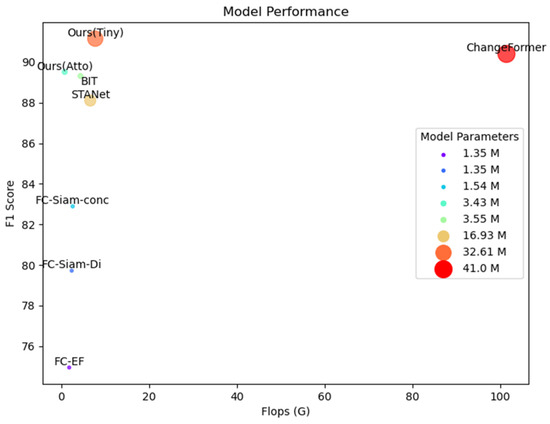 To further analyze the complexity of MFSFNet, we calculated the parameter size and computational complexity of different models in Figure 8. The F1 score of different methods on the LEVIR-CD dataset was represented. Although FC-EF, FC-Siam-Di, and FC-Siam-Conc models have the fewest parameters, their accuracy, and performance are the poorest, making them less suitable for practical scenarios. Therefore, we exclude these three models from the following analysis.