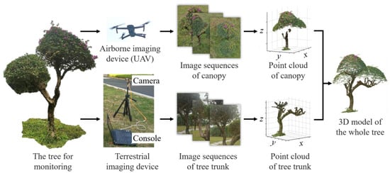 The hybrid phenotypic structure monitoring system of trees encompassing a UAV and a terrestrial acquisition platform is shown in Figure 1. For agricultural and forestry trees, canopy data are acquired by a low-altitude remote sensing platform (UAV, DJI MAVIC 2) [26]. However, due to the limited flight range and blind zone of the camera, it is not a trivial task to capture complete images of the tree trunk. The terrestrial acquisition platform (RGB camera) is capable of capturing more detail of the tree trunk texture. Therefore, the image capture capabilities of these two platforms are combined to obtain a comprehensive image of the trees. Finally, the 3D reconstruction based on the image sequence is conducted to construct the point cloud model of the canopy and trunk. Those two point clouds are converted into the world coordinate for registration and result in the generation of a 3D model encompassing the entire tree.