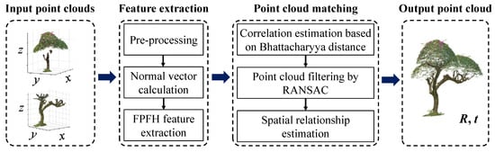 After reconstructing the point clouds of the canopy and trunk using different visual platforms, feature extraction and registration are performed to reconstruct the complete plant model. This process is shown in Figure 2. The key steps are: (1) The point cloud data are preprocessed to eliminate the outliers caused by background and noise. This step not only suppresses the disturbance but also reduces the data size, which improves both accuracy and efficiency of subsequent point cloud processing. (2) The 3D feature descriptor (FPFH) of the point cloud is calculated to characterize the local geometric features of the spatial points. (3) The correlation between the canopy and trunk points is evaluated via the Bhattacharyya distance, and the matching point pairs are identified according to the configured correlation rules. (4) The point cloud data are sampled based on the correlation level and the distance distribution. Subsequently, a set of matching point pairs is generated. The mismatching point pairs are removed based on RANSAC. (5) The estimated transformation (rotation matrix R and translation vector t) between point clouds is solved based on multi-view geometry. Point cloud stitching is then implemented based on the transformation.