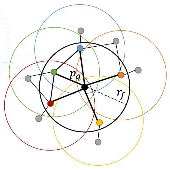 The spatial neighborhood of point for the calculation of its FPFH features. The dots in different colors are the centers of the corresponding spherical spaces.
