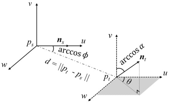 In order to characterize the spatial relationship of the point pairs, a Darboux coordinate system u-v-w corresponding to the point pairs is established. As shown in Figure 6, and are the source point and target point, respectively, and and are the estimated normal vectors of and , respectively. The axis is consistent with the direction of the normal , the direction of the axis is the direction of the vector obtained by the cross product , and the axis is perpendicular to the u-v plane and conforms to the Cartesian coordinate system criterion. It is worth noting that the features based on the local reference frame have translation and rotation invariance.