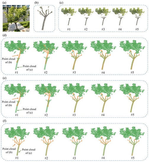The inputs and the registration results of tree-1: (a) the actual scene photo of tree-1; (b) point cloud obtained by terrestrial capture platform; (c) point cloud obtained by UAV; (d–f) registration results of SAC-IA, SAC-IA + ICP, and the proposed method, respectively. Experiments are numbered from #1 to #5.