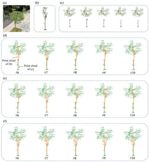 The inputs and the registration results of tree-2: (a) the actual scene photo of tree-1; (b) point cloud obtained by terrestrial capture platform; (c) point cloud obtained by UAV; (d–f) registration results of SAC-IA, SAC-IA + ICP, and the proposed method, respectively. Experiments are numbered from #6 to #10.