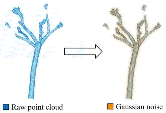 Point cloud preprocessing includes background removal, denoising, and downsampling. Firstly, the target tree is manually cropped from the original point cloud. Owing to the noises produced by sensors and 3D reconstruction errors, outliers are generally generated and sparsely distributed in the reconstructed point clouds, which may cause mismatching of partial point clouds and result in the failure of registration. To address this problem, a statistical filtering method is used to delete the outliers. First, the average distance of each point in the point cloud to its k-neighborhood points is calculated. Then, the mean μ and standard deviation σ of all average distances are calculated. Based on the Gaussian distribution, most data points are expected to be distributed within a certain range around the mean value, and those data points that significantly deviate from the mean value can be considered as outliers. To identify the outliers, a commonly used method is to assess the average distance of each point to its k-neighborhood neighbors using a global threshold. The threshold in statistical filtering method is defined as: