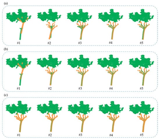 The registration results of tree-1 with added noise: (a–c) the registration results obtained from SAC-IA, SAC-IA + ICP, and the proposed method, respectively. Experiments are numbered from #1 to #5, corresponding to those shown in Figure 7.