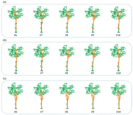 The registration results of tree-2 with added noise: (a–c) the registration results obtained from SAC-IA, SAC-IA + ICP, and the proposed method, respectively. Experiments are numbered from #6 to #10, corresponding to those shown in Figure 8.