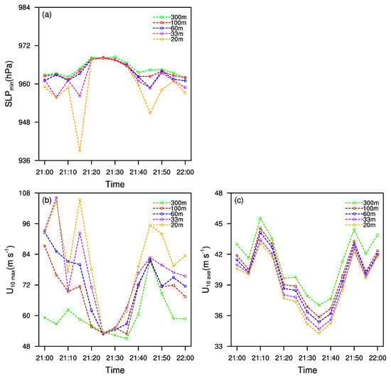 Time series of (a) instantaneous grid minimum sea level pressure (hPa), (b) maximum 10 m horizontal wind speed (m s−1), and (c) domain-averaged 10 m horizontal wind speed (m s−1) over an area of 12 km × 12 km from LESs with different grid resolutions in the time period from 21:00 UTC to 22:00 UTC.