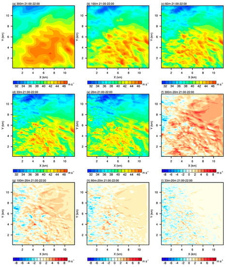 To clearly show the differences of wind fields resolved by the different grids, Figure 3f–i shows the wind speeds in domain d04, d05_1, d05_2, and d06_1 subtracted by those of d06_2, respectively. Compared with the coarser grid simulations, the strong wind speeds in d06_2 are mainly on the west part of the domain. These local wind maxima are produced by the downdrafts associated with the overturning large turbulent eddies, and such a mechanism has been described in Wu et al. [].