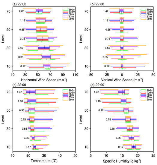 Profiles of (a) horizontal wind speed (m s−1), (b) vertical velocity (m s−1), (c) temperature (°C), and (d) specific humidity (g kg−1) for d04 to d06_2 at 22:00 UTC in the innermost 12 km × 12 km domain. The box represents the 25th, 50th, and 75th percentiles of the data. The horizontal line spans from the minimum value to the maximum value, and the numbers next to the box represent the height above the ground in kilometers. The Y-axis is the model level, and the data shown are at an interval of 10 levels.