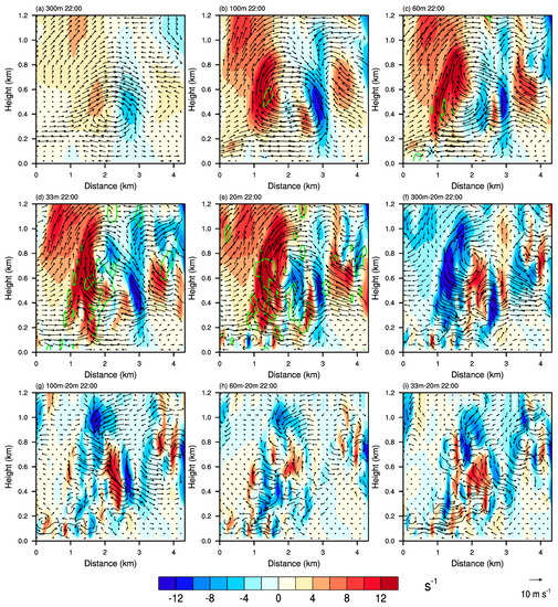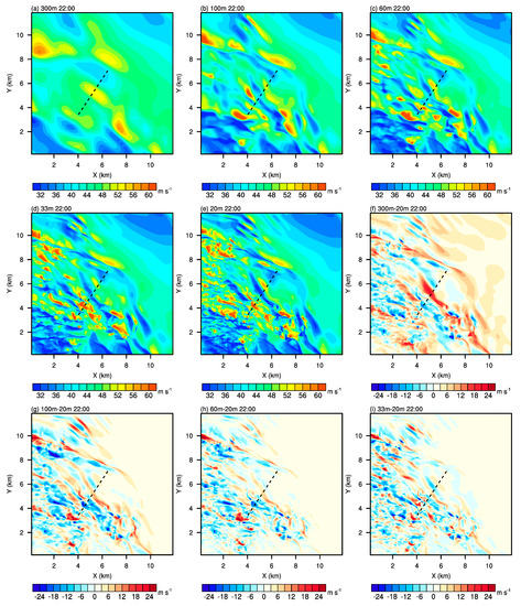In the high wind area of a TC, notable characteristics include not only strong winds and intense convection but also the presence of mesovortices and smaller-scale vortices, such as rolls and tornado-scale vortices, as observed in previous studies [,,,]. How the resolution will affect the simulation of the rolls in the TC boundary layer is also an important question to be discussed in this study. In our LESs, similar large turbulent eddy circulations are also shown. As an example, Figure 5 shows a snapshot of 10 m wind speed (U10) at 22:00 UTC where the black dashed line oriented southwest to northeast indicates the model resolved turbulent roll circulations. These rolls are generally aligned with the streamlines giving the wave-like appearance. Similar turbulent roll circulations in a TC environment explicitly resolved by LESs have been previously reported by many studies [,,]. To clearly show the vertical structures of the simulated roll circulations by different domains, Figure 6 plots the vertical cross-section of vertical velocity and vertical overturning circulations along the black dashed line indicated in Figure 5. Note that, to clearly show the vertical structure of rolls, the mean horizontal wind speeds over the area have been removed. It can be seen that, in the 300 m resolution simulation of d04, there is only one kilometer-scale roll in the scene, but the roll breaks down into two cells when the grid spacing decreases to 100 m. As the grid resolution is increased, finer eddy structures emerge through the fragmentation of eddies in coarser simulations. These structures exhibit relative vorticity values exceeding 0.1 s−1. At the grid spacing of 33 m to 20 m, there are still apparent differences in eddy structures, for example, hectometer-scale eddies with the vertical velocity exceeding 10 m s−1 are seen near the surface in the 20 m resolution simulation of d06_2, but they are not clearly visible in the 33 m resolution simulation of d06_1.