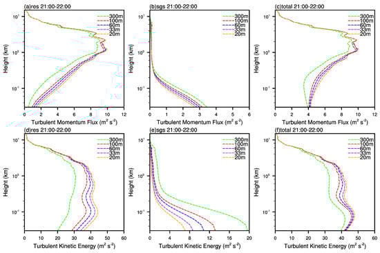 Vertical profiles of turbulent momentum fluxes and TKEs from simulations with different grid resolutions averaged over the innermost domain covering an area of 12 km × 12 km and the period from 21:00 UTC to 22:00 UTC. (a) Model-resolved turbulent momentum flux (m2 s−2), (b) SGS turbulent momentum flux (m2 s−2), (c) total turbulent momentum flux (m2 s−2), (d) model-resolved TKE (m2 s−2), (e) SGS TKE (m2 s−2), and (f) total TKE (m2 s−2).