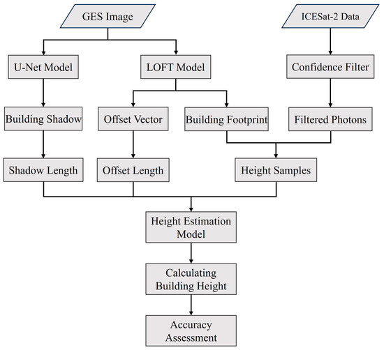 The workflow of our proposed method is depicted in Figure 2. The method includes five steps: roof-to-footprint offset extraction, shadow length extraction, height samples calculation from ICESat-2 data, building height retrieval, and accuracy assessment. The specific details are as follows.