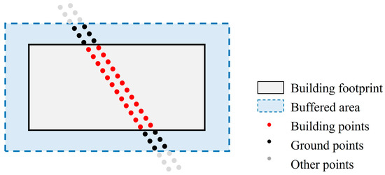 Here, we employed a buffer zone approach for building height calculation. As shown in Figure 4, we first marked all the photons that fell in the building footprint as candidate roof photons (red points) and labeled the photons located within 5 m buffered area [46] of the footprint as candidate ground photons (black points). Among all candidate roof photons, the ones with larger z values are more likely to be real roof photons. Conversely, for all candidate ground photons, the ones with smaller z values are more likely to be real ground photons. Therefore, we used a percentile approach to determine the elevation of the building roof. That means that the elevation of a building roof was calculated as a specific percentile of all elevations of the candidate roof photons on the corresponding roof part. In our experiments, we selected ten buildings as examples and used seven numbers—50, 60, 70, 80, 85, 90, and 95—as percentiles to calculate the roof elevation. Their results were compared with reference roof elevation. Our results indicated that the 90 percentile be selected for roof elevation calculation because of its relatively better performance. For ground elevation calculation, the 10 percentile was selected due to the smaller errors. Finally, the building height was determined by the difference between the roof elevation and the ground elevation.