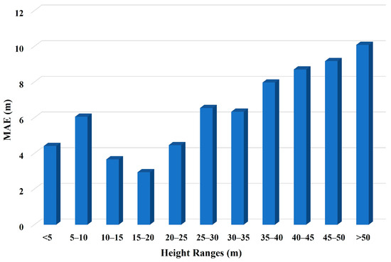 Figure 8 illustrates the MAEs at different ranges of building heights. The result reveals that there was no substantial correlation between the MAE of height estimation and the building height. Nevertheless, a general trend emerged, indicating that lower buildings exhibit smaller MAEs, whereas taller buildings tend to have larger MAEs. Specifically, buildings with heights ranging from 10 to 25 m exhibit the minimum height estimation error, while structures exceeding 30 m in height often display the largest estimation error.