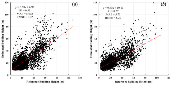 The building height estimation accuracies of (a) offset-based and (b) shadow-based methods. The red dash line is the 1:1 line.