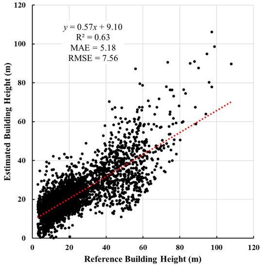 The building height estimation accuracy of the improved shadow-based method [46]. The red dash line is the 1:1 line.