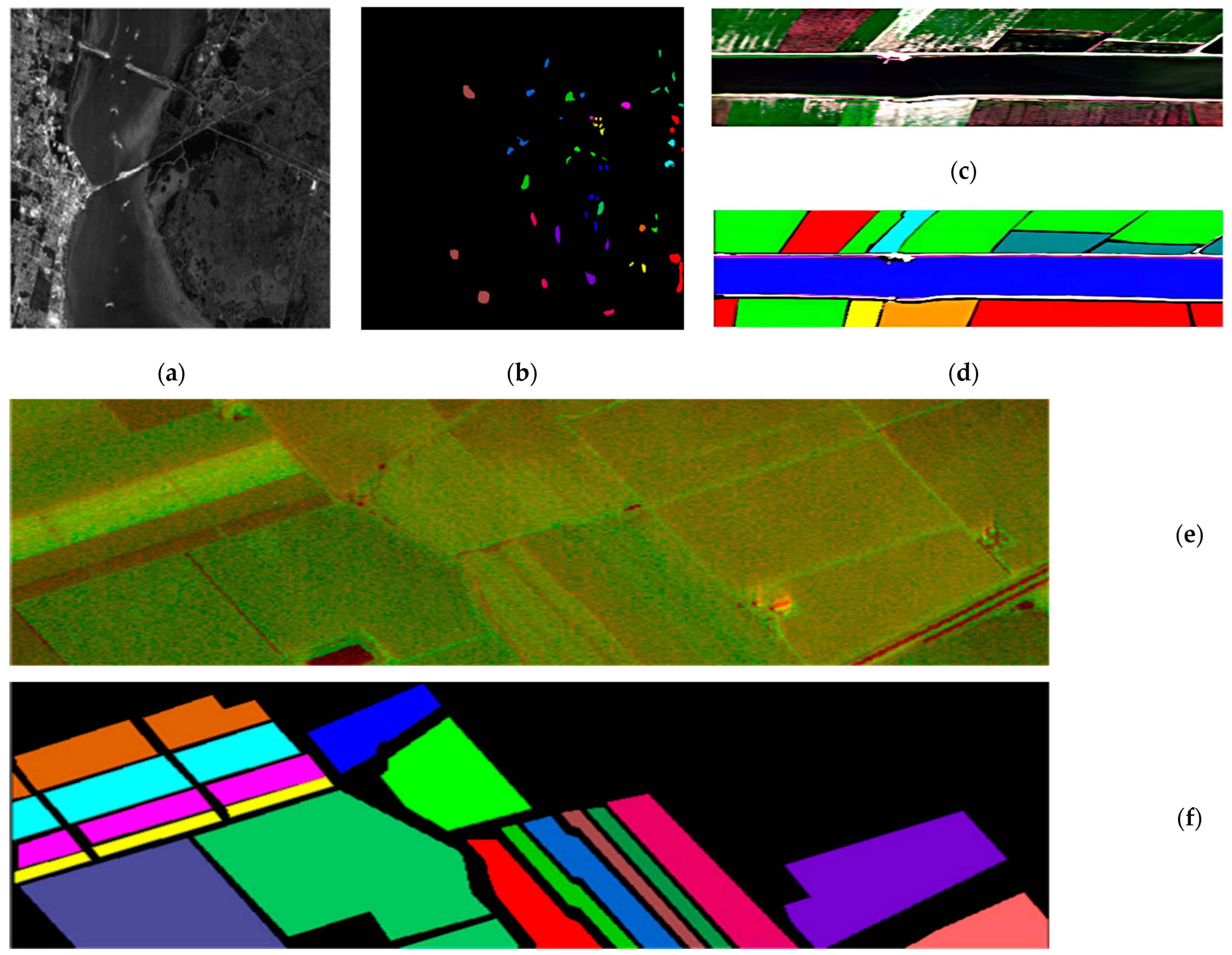 The third dataset was obtained in Longkou Town, Jingzhou City, Hubei Province, China, and includes six classes in an agrarian context. The UAV flew at an altitude of 500 m, and the spatial resolution of the airborne hyperspectral image is approximately 0.463 m. The image size is 550 400, with 270 bands ranging from 400 to 1000 nm.