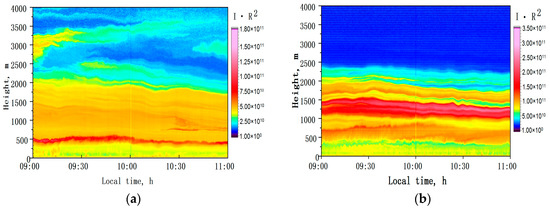 The color scale on the right side of the figures corresponds to the magnitude of the range-corrected lidar signals for the wavelength λ = 1064 nm, where atmospheric aerosols have the strongest contribution to the light-scattering response from air. The spatial resolution is 6 m, and the temporal resolution is 1.6 s. All the figures show the results of observations from 9 to 11 am, when the processes in the atmosphere are the most dynamic due to turbulent exchange. The signal slightly changes with altitude in all the figures. The patterns are stable layered structures, where the aerosol layers are a few hundred meters thick. According to the color scale, the following altitude ranges can be distinguished: 0–400, 400–500, 500–1000, 1000–1500, and 1500–2000 m. The height of the ABL is 2500–3000 m. There is no mixing layer due to the cold water surface.