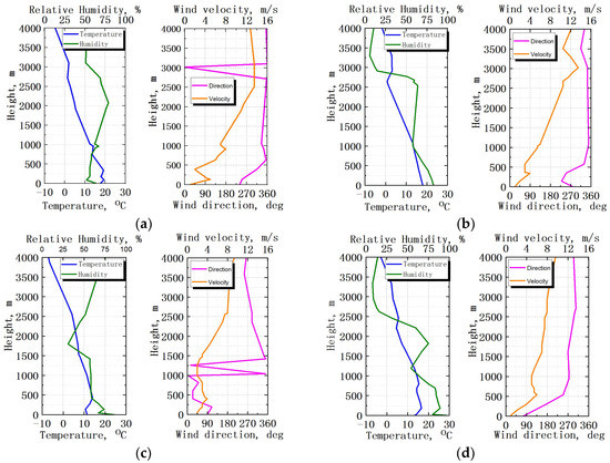 Altitude variations in atmospheric meteorological parameters [33]: (a) 8:00 a.m., 3 August 2015; (b) 8:00 a.m., 6 August 2016; (c) 8:00 a.m., 23 July 2018; (d) 8:00 a.m., 2 August 2019.