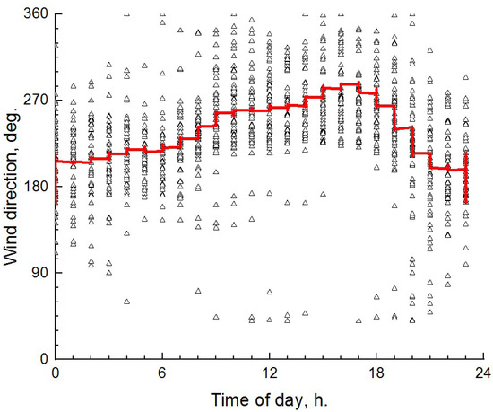 Daily variations in the wind direction according to observations at Boyarsky site; the red curve shows the average values. Each point (triangle) was derived by averaging over an hour.