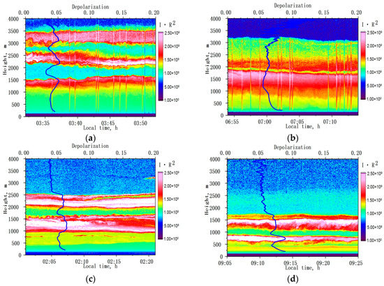 Spatiotemporal structures of aerosol in the troposphere observed with the LOSA-A2 lidar at a radiation wavelength of λ = 532 nm during ship expeditions, and the vertical profile of the degree of depolarization (blue lines) at night and in the morning: (a,b) on 22 July 2018 and (c,d) on 27 July 2019. Color scale—range-corrected lidar signals (λ = 532 nm).