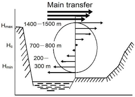 As was shown by the authors of [13], according to the results of aircraft observations over Baikal, the effect of internal hollow air circulation was discovered. This effect is not associated with the main western transport and is manifested in the movement of air along the western coast from north to south and along the eastern coast from south to north. The vertical length of such circulation cells is 1400 m (Figure 9). The lower boundary is located at a height of 300 m, and the center of the cell is located in an area of 800 m. The basin circulation in Baikal is quite stable over time.
