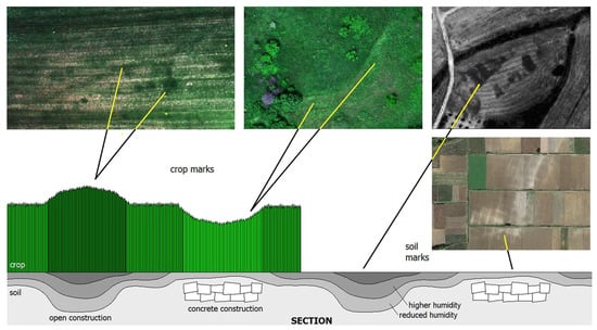 Aerial and remote sensing archaeology is founded on the ability to observe surface phenomena associated with the presence of objects below the ground surface [1]. These are methods of archaeological prospection (non-destructive techniques) that indicate possible locations with covered archaeological remains on the images (known as marks). The archaeological excavation follows and documents or rejects the archaeological interest of the sites. Underground archaeological remains can affect bare ground or vegetation, causing a lack of moisture (presence of a solid structure below ground, e.g., building foundations) or excess moisture (presence of an open structure below ground, e.g., a ditch) in the ground that covers them. Thus, by extension, differences in the height and/or quality of vegetation are observed on the one hand, and differences in the surface temperature of the object of observation (soil or vegetation) on the other (Figure 1). These differences are captured as marks in the images of the aerial or satellite sensors [2]. To date, countless new discoveries of underground archaeological remains have been made through aerial and remote sensing archaeology, utilizing a variety of sensors (RGB, multispectral (MS), Thermal camera, Lidar) [3,4,5,6,7,8,9]. For example, Negula et al., 2020, with the help of vegetation indices generated from Sentinal-2 satellite images, identified underground Roman roads and walls [3]. Additionally, Abate et al., 2020, using Sentinal-2 satellite images and transforming them with the Principal Component Analysis technique, identified marks of circular or sub-circular shapes of Neolithic settlements, geometric shapes of the Classical period, rectangular farmhouses of the medieval period and paleochannels and roads of different ages [4]. Hill et al., 2020, highlighted the importance of the combined use of thermal and Near Infrared (NIR) images from UAS for the identification of underground archaeological remains [5]. According to the research/review by Adamopoulos and Rinaudo, 2020, UAS-based archaeological remote sensing applications and, especially, those dealing with the beyond-visible spectra to identify MS contrast variations are scarce [6]. Converging towards this, Materazzi and Pacifici, 2022, added that while UAS are used in many applications of archaeological interest, few of those applications aim to identify marks of covered archaeological remains, and even fewer of those exploit MS images. In their research, the generation of vegetation indices exploiting MS images from UAS enabled the identification of crop marks of covered archaeological remains [7].