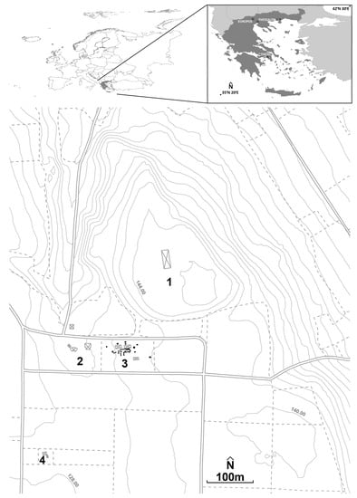 The Archaic Acropolis of Europos (40°53′15.5″N 22°33′20.0″E, Figure 2) is located 55 km northwest of Thessaloniki (Greece) and just 15 km from ancient Pella (capital of the Macedonian Kingdom, Greece).