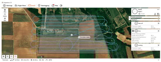 The WingtraOne GEN II UAS (Figure 3) was used in this study. It is a fixed-wing, VTOL—vertical take-off and landing type UAS. Its weight is 3.7 kg and without the central base it has dimensions 125 × 68 × 12 cm. Its maximum flight time is up to 59 min. It has an integrated Global Positioning System (GPS), while for the calculation of the coordinates of the centres of the images it receives, it uses a Post-Processing Kinematic (PPK) system. The flight plan and all flight parameters are defined through the WingtraPilot® software. It has two propellers and takes off (and lands) vertically. After take-off it turns horizontally and continues its course as a fixed-wing aircraft (and vice versa during landing). It has two sensors, the RGB and the multispectral (MS) sensors (Table 1) [13].