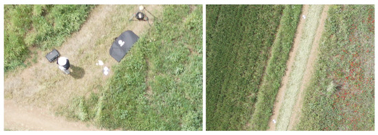 To check the horizontal and elevation accuracy of the final products (digital surface models (DSMs) and orthophotomosaics), three targets on the ground (Figure 8) were measured with GPS using the RTK method before the flights. These are simple paper targets that we created, 32 × 32 cm in size. Their coordinates (X, Y and Z) were then compared with the coordinates obtained from the products (DSMs and orthophotomosaics) of the image processing.