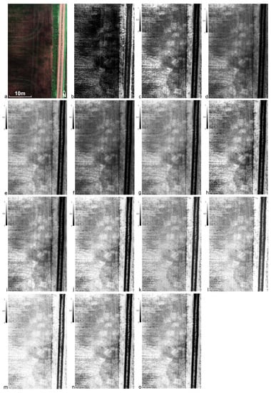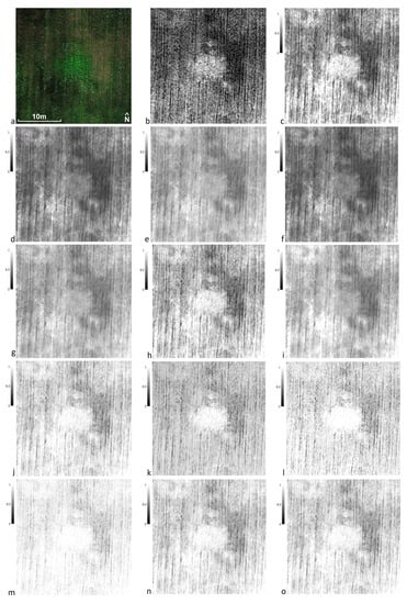 In a positive crop mark observation position measuring 4.5 m × 6.5 m. Excerpts of images and indexes (a) RGB; (b) NIR; (c) SR; (d) GCI; (e) GNDVI; (f) GRVI; (g) GSAVI; (h) MSR; (i) NDRE; (j) NDVI; (k) NDVIRE; (l) NGRDI; (m) NLI; (n) OSAVI; and (o) SAVI. The grayscale of the images is from 0 (black) to 1 (white), giving 0 to the poorer and 1 to the best results of the index (e.g., for NDVI the value 0 corresponds to pixels without crop, 0.5 to pixels with poor growth or with poor crop health and 1 to pixels with good growth or healthy crop).