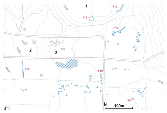 Extract of Figure 2 with the crop marks added in blue. In grey within the open archaeological site (location 3), are the existing open or closed ancient tombs of the Roman and early Christian cemetery that can be visited. The F code corresponds to the figures in which the marks are presented (e.g., the mark of Figure 9 has the code F9).