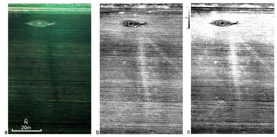 In general, the indexes were not decisive for the identification of marks of possible underground archaeological remains (the word “possible” should always be used, as only systematic archaeological research and excavation can establish that detected anomalies in the soil or vegetation are due to the presence of archaeological remains below ground). The marks were mainly located in the Near Infrared (NIR) band of the orthophotomosaic. In some cases the indexes improved the visual observation of the marks, and in particular the index that allowed this was SR (e.g., Figure 9 and Figure 10).