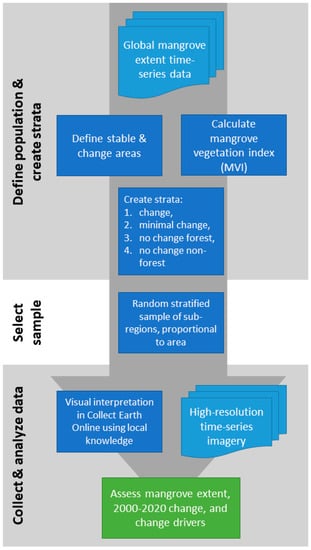 Our hybrid methodology used existing remote-sensing mangrove maps for the stratification and sample allocation and local interpreters for the data collection (Figure 2). To define the strata for our sampling design, we created three key maps: a Mangrove Vegetation Index (MVI) map, a mangrove presence map and a mangrove change map. The MVI layers were produced using cloud-free Landsat 7 and Landsat 8 Tier 1 images following [16], and the band arithmetic equation MVI = (NIR − Green)/(SWIR1 − Green). Higher values of MVI in a pixel indicate a higher likelihood of mangroves being found in the pixel.
