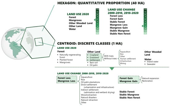 Each sample had two levels of analysis: discrete classes at the centroid level (1 ha- square) and quantitative estimation of each class at the hexagon level (39.6 ha), see Figure 3. The main land use classes used in this mangrove assessment are structured according to the terms and definitions used in [21] (Appendix A). The mangrove-specific classes for land use, land-use change and deforestation drivers are based on a review of the relevant literature [22,23,24].