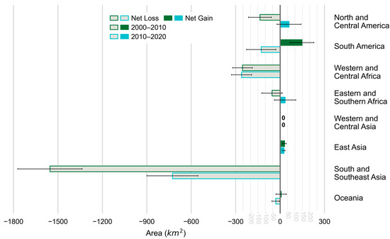 Net change in mangrove area by decade and subregion. Error bars represent standard errors.