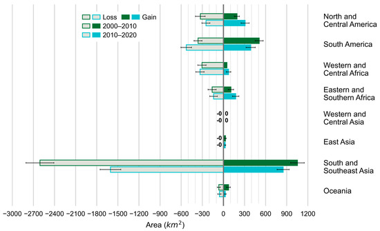 Examining subregional changes, we can identify trends behind differences in net change (Figure 5). South and Southeast Asia saw declines in the rate of both mangrove gain and mangrove loss, with a greater magnitude of change in the rate of mangrove loss leading to a net decrease in the rate of mangrove loss. North and Central America and Eastern and Southern Africa both saw decreased rates of mangrove loss and increased rates of mangrove gains, leading to a net increase in mangrove gain. Conversely, South America and Western and Central Africa both saw increased rates of mangrove loss and decreased rates of mangrove gain, leading to a net increase in mangrove loss between the two decades. However, Oceania’s observed net increase in mangrove loss can be attributed to the decreased rate of mangrove gain instead of any change in the rate of mangrove loss.