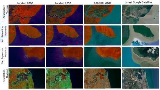 Examples of anthropogenic and biophysical drivers of mangrove loss and gain. Latest Google Satellite image refers to the latest very high-resolution image available in Google Earth for the location.