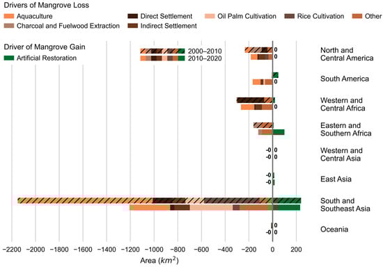 Identifying and quantifying the anthropogenic and biophysical drivers of global mangrove losses and gains at a global scale is essential for monitoring mangrove ecosystems and the services they provide [1]. Identifying these change drivers helps to inform mangrove conservation and carbon mitigation efforts [2,3,4]. This assessment can also inform resource allocation to regions where conservation may be more effective and can identify policies and programmes that can be actively implemented to improve conservation [5]. Identifying causes of mangrove loss can address continued threats necessary to move forward toward zero net loss in global mangroves [2].
