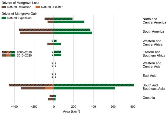 Globally, natural retraction is the largest biophysical driver of mangrove loss, and natural expansion is the largest driver of mangrove gain in both decades (Figure 6 and Figure 8). While the net global mangrove change was negative over the study period, we found that areas of natural expansion far surpassed areas lost to natural retraction and natural disasters. The natural expansion is 158% of the area of natural losses between 2000 and 2010 and 170% of natural losses between 2010 and 2020. Across both decades, this represents an area of expansion of 2968 km2 compared with an area of retraction of 1812 km2.