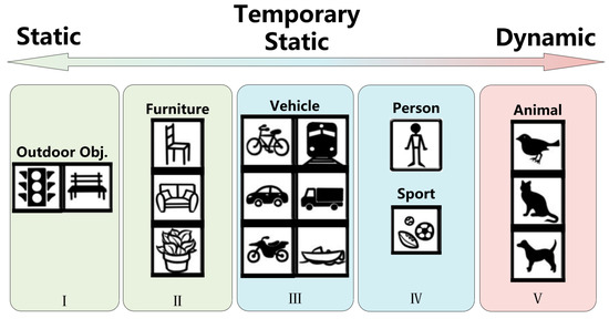 The feature point classification is divided into two parts. The first part is to classify the COCO categories according to the possibility of motion based on life experience. The classification is divided into five levels (I to V), with higher levels indicating a higher possibility of movement. Level I includes public facilities (e.g., traffic light and bench), Level II includes furniture (e.g., chair, sofa, and bed), Level III includes transportation (e.g., bicycle, car, motorbike, bus, truck, and boat), Level IV includes sports (e.g., football and basketball) and people (e.g., person), and Level V includes animals (e.g., cat, dog, and bird), as depicted in Figure 2.