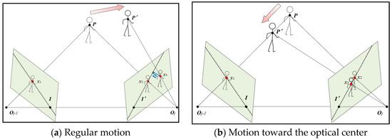 Epipolar constraint for temporary static points. (a) Epipolar constraint in regular cases. (b) A special case for moving toward the optical center . The blue line represents the distance between the feature point and its epipolar line. The short dashed lines indicate the epipolar lines.