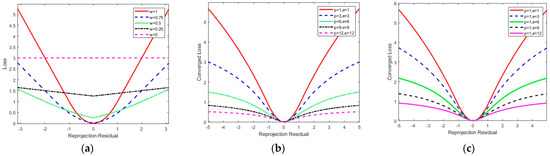 Changes in loss with various parameters. (a) Loss of one feature with . (b) Converged loss of one feature with different dynamic factors, and . (c) Converged loss of one feature with fixed.