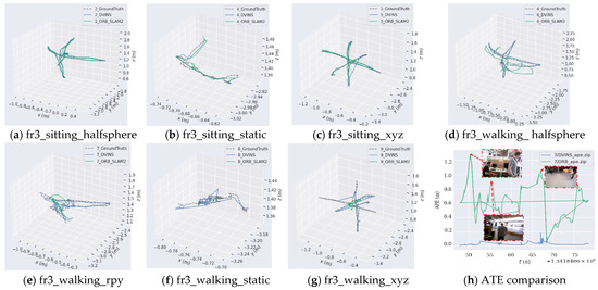 In the experimental results shown in Table 1, Table 2, Table 3, Table 4 and Table 5, D-VINS and the contrasting SLAM systems were all validated. D-VINS outperformed the other systems in terms of the ATE and RPE in six sequences of the TUM RGB-D dataset. Table 1 and Table 2 demonstrate the effectiveness of D-VINS’ dynamic object removal method, especially in scenarios involving pure rotation and high-occlusion areas, compared to semantic-based methods like RS-SLAM and DS-SLAM. Moreover, RS-SLAM and Dynamic-VINS are limited to indoor usage due to their reliance on depth information, making them unsuitable for outdoor environments.