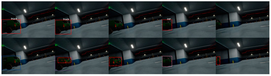 Result of the YOLOV5 detection test. Top: original detection results of YOLOV5. Bottom: detection results after using the compensation algorithm in Section 3.1.1. The red box shows the position of clustered features for compensation.
